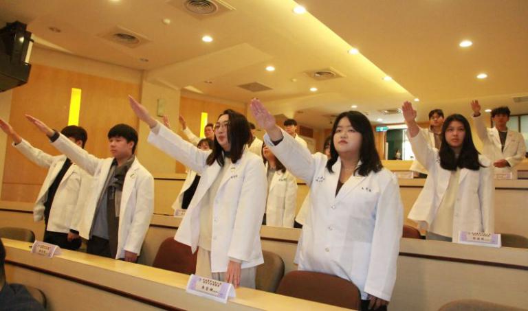 ▲元培視光系學生授袍後宣示恪遵專業倫理與規範。(圖/記者蔣彤雲攝)