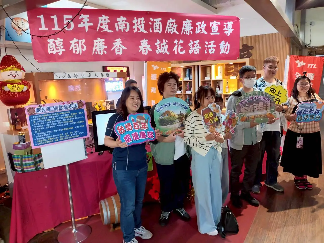 本次活動由南投酒廠政風室精心規劃「春漾廉誠」兩大關卡,將艱澀的政令條文轉化為趣味互動,透過觀賞廉政宣導影片、手持宣導牌拍攝合照及互動問答等有獎徵答,引導民眾於輕鬆愉悅情境中認識廉潔誠信的重要性,活動氣氛熱絡,深獲民眾好評。
