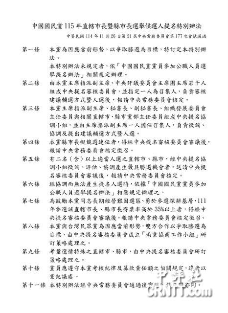 綜合報導/中國國民黨中常會今日通過“中國國民黨2026年直轄市長暨縣市長選舉候選人提名特別辦法”,其中考量部分縣市“藍白合”,該辦法特別明訂,國民黨與民眾黨為因應當前形勢,雙方合作以爭取勝選為目標,由中央提名審核委員會成立“兩黨協商工作小組”研訂策略處理之。 國民黨副秘書長兼組發會主委李哲華指出,未來兩黨協商工作小組將進行對口溝通,雙方會盤點需要合作且有競合關係的縣市,至於如何建立機制,將留待未來協商處理。 而國民黨今天要通過此提名辦法前,李哲華有先知會民眾黨秘書長周榆修此事,並強調這是為了讓黨內現任優先的提名機制能順暢運作,並非國民黨這台火車要自己先開走,而周也表達完全理解的立場。 國民黨中常會今日還通過中央提名審核委員會名單,成員包括擔任召集人的國民黨副主席兼秘書長李乾龍、國民黨副主席季麟連、張榮恭、蕭旭岑,以及前國民黨秘書長曾永權與中評會主席團主席林政則、林中森、蔡鈴蘭、吳志揚等人。 李哲華在中常會後受訪表示,今天通過的提名辦法,最主要是針對選情單純的部分,能夠先進行提名作業。至於藍白合作的縣市,在提名辦法中成立了兩黨工作協商小組,未來會跟民眾黨進行對口溝通,雙方盤點需要藍白合作、競合的縣市,會再就此部分建立機制,待雙方協商時再做處理。