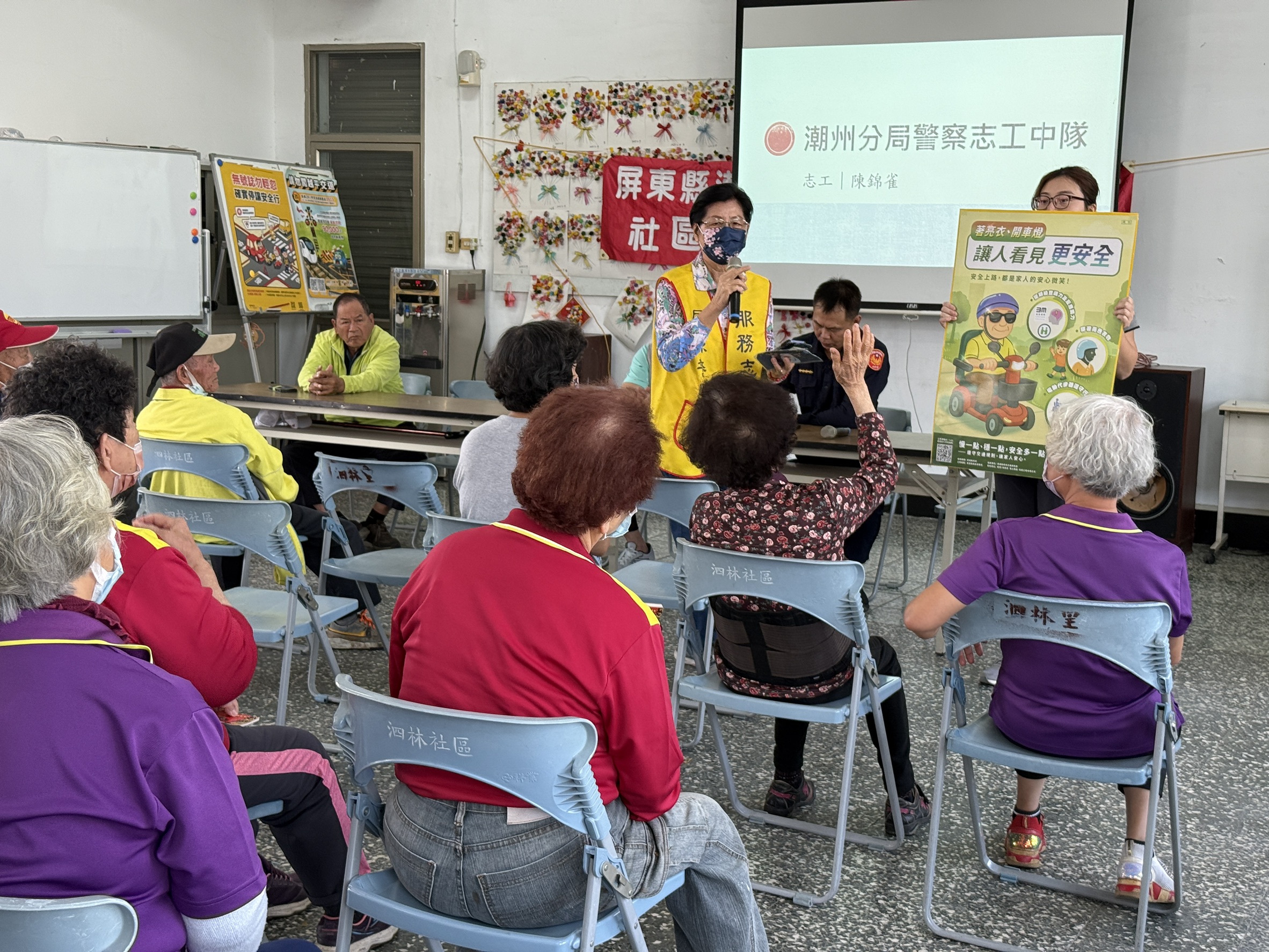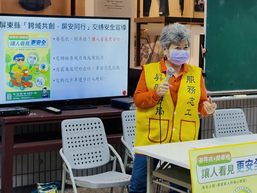 潮州分局警察志工輪番上陣,以親切自然的方式與民眾互動,志工夥伴們用自身的生活經驗,分享實際案例,從行人安全、機車防禦駕駛,到長者用路注意事項等面向,逐一說明交通潛在風險與正確應對方式。在談到「保持安全距離」的重要性時,志工李素瑛以自身經驗幽默分享,表示每當搭乘家人駕駛的車輛,若發現與前車距離過近,自己也會不自覺地跟著踩起「空氣煞車」,生動比喻讓現場民眾會心一笑。