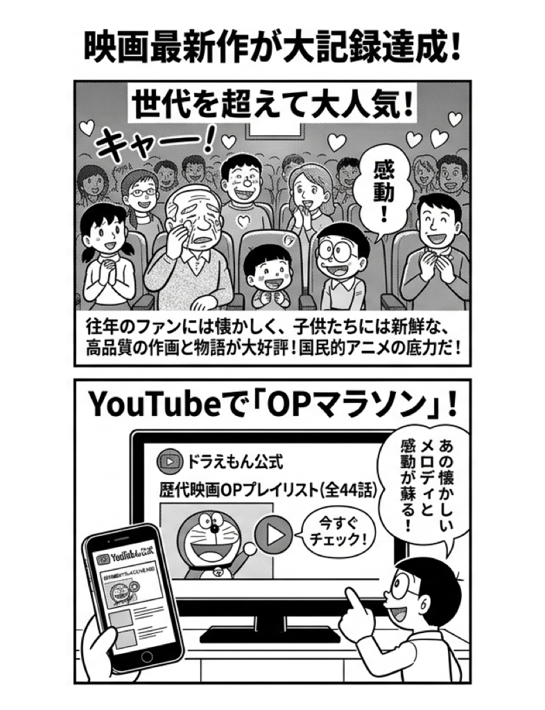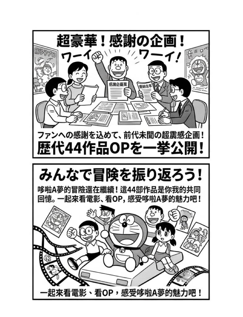 為回饋讀者,官方特別在 YouTube 等平台公開了歷代 44 部作品的片頭影像。從初代《大雄的恐龍》到最新的《新·海底鬼岩城》,這不僅是哆啦A夢與大雄的冒險史,更是日本動畫技術演進的縮影。粉絲可以從中重溫那熟悉的旋律與感動,觀察作畫風格與科技感的變遷。