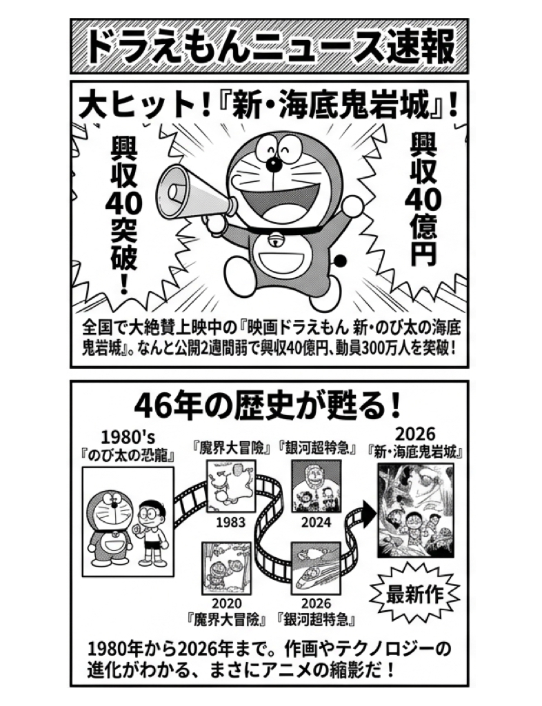 文/JO HSU 全日本熱映《哆啦A夢》系列最新作品—《電影哆啦A夢:新·大雄的海底鬼岩城》,官方興高采烈宣布票房突破 40 億日圓大關!為感謝廣大粉絲的支持,官方同時釋出史無前例的超震撼慶祝企劃:一口氣解禁自 1980 年首作以來,歷代 44 部劇場版的珍貴片頭影像! 票房佳績 經典重製再次引發熱潮作為系列中最受歡迎的經典之作重製,本作自上映以來便好評如潮。不僅成功喚起成年觀眾的童年回憶,更以現代高品質的作畫水準征服了新一代的孩子們。在上映不到兩週的時間內,便迅速達成票房破 40 億日圓、動員人數超過 300 萬人的壯舉,展現出《哆啦A夢》身為國民級 IP 的強大實力。 豪華企劃 橫跨 46 年的「片頭馬拉松」為回饋讀者,官方特別在 YouTube 等平台公開了歷代 44 部作品的片頭影像。從初代《大雄的恐龍》到最新的《新·海底鬼岩城》,這不僅是哆啦A夢與大雄的冒險史,更是日本動畫技術演進的縮影。粉絲可以從中重溫那熟悉的旋律與感動,觀察作畫風格與科技感的變遷。 深海下的友情與壯闊冒險《新·大雄的海底鬼岩城》延續了原作對深海秘境與消失文明的壯闊想像,更深入挖掘了大雄與越野吉普車「巴基」之間的深厚友誼。不少觀眾紛紛表示,「最後的場景不管看幾次都會流淚」、「重製版將大海的神秘感表現得太出色了」。 製作團隊深情感言 傳承勇氣與希望製作委員會表示,「非常驚喜看到這部跨越時代的作品能再次得到大家的喜愛。我們希望透過解禁歷代影像,讓大家在觀賞新作的同時,也能回想起那些曾陪伴自己成長的冒險時刻。」 書籍/影片資訊 作品名稱:映画ドラえもん 新・のび太の海底鬼岩城(電影哆啦A夢:新大雄的海底鬼岩城) 解禁內容:歷代 44 部作品片頭影像(期間限定公開) 票房進度:累計突破 40 億日圓 發布日期:2026 年 4 月 20 日 Please enable JavaScript to view the comments powered by Disqus.