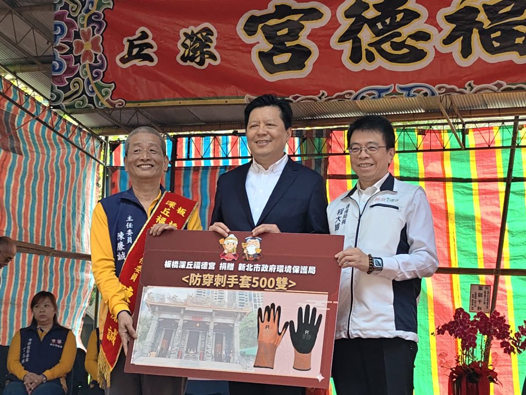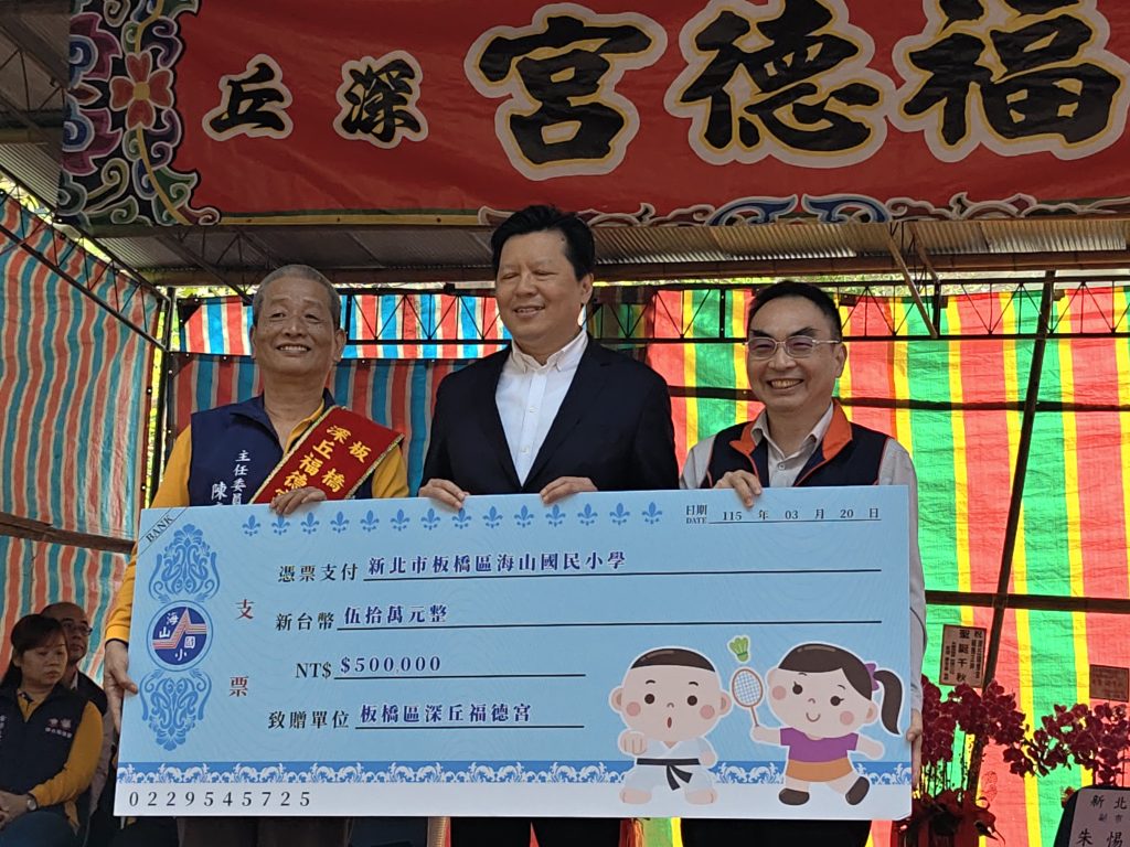 副市長朱惕之表示,深丘福德宮是新北市政府的好鄰居,長年積極從事公益志業,近年更連續捐贈救護車、復康巴士及環保監視器等設備。今年廟方在主委陳廉誠帶領下,再度大手筆捐贈市府消防局「勘災指揮車」一輛、警察局「警安基金」50萬元、社會局「輔具一批」(包含氣墊床、拐杖、輪椅、氧氣製造機等,市值約100萬元),以及環保局板橋區清潔隊「防割傷穿刺手套」500個;此外更捐贈海山國小及海山國中「馬上關懷基金」各50萬元,合計100萬元。朱副市長強調,這些物資將直接投入救災、治安、社福及環保第一線,善行義舉令人欽佩。