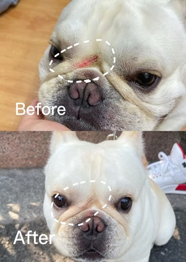 那天真的嚇到。我只是拆個箱子,沒注意,美工刀就這樣劃過去,結果不小心割到法鬥的皮膚。那一瞬間,我整個心都涼了。我先幫牠做了基本清潔、擦乾血跡,接著拿出我家的「毛孩皮膚的OK繃」,輕輕噴上去,沒有刺激味,也不會讓牠掙扎。