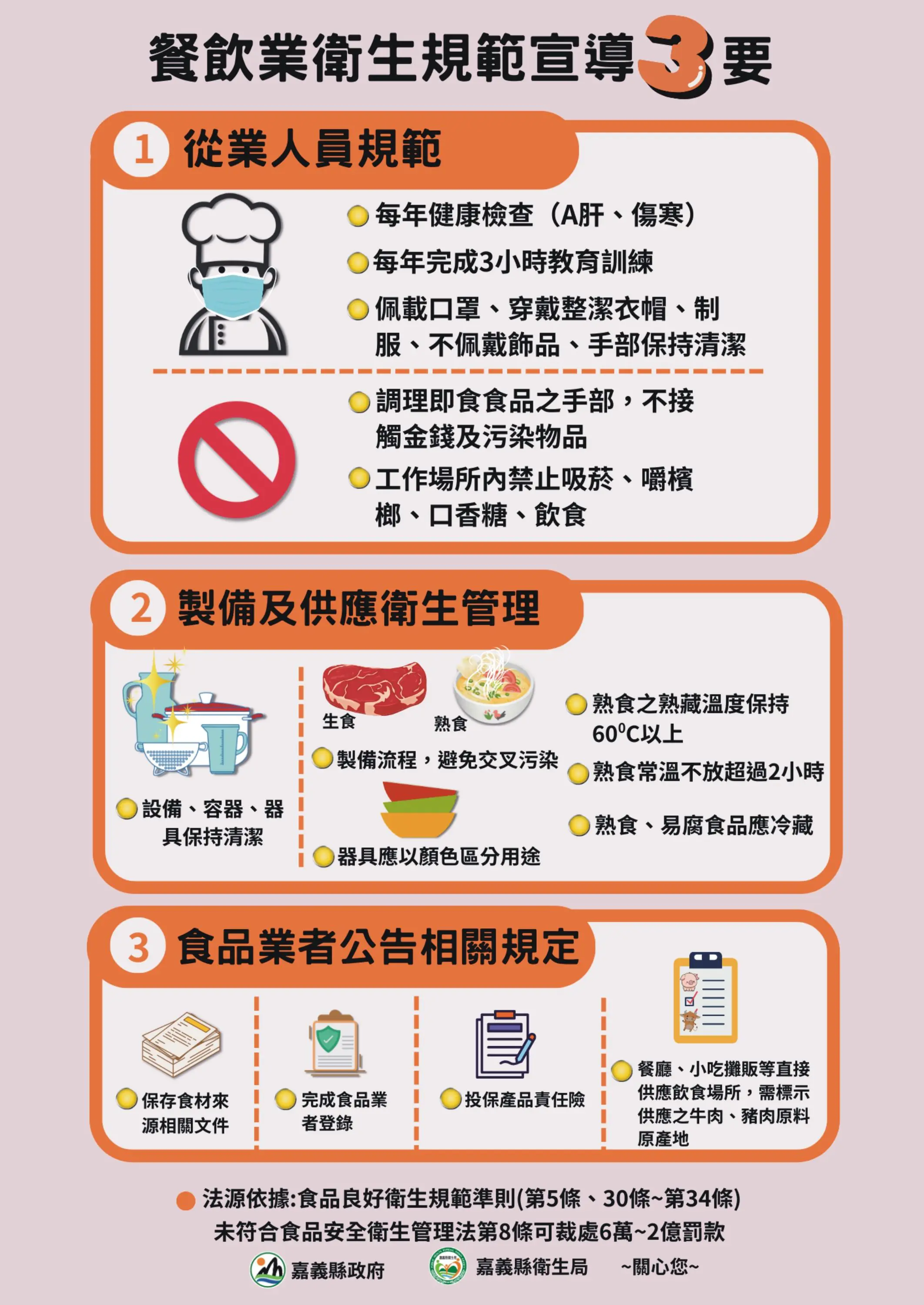 此外,也落實會場登錄與現地輔導並行,針對周邊各店家及各食品攤位實地輔導食品良好衛生規範準則等相關法規,打造嘉縣優良飲食環境,維護旅客用餐的衛生安全及品質。