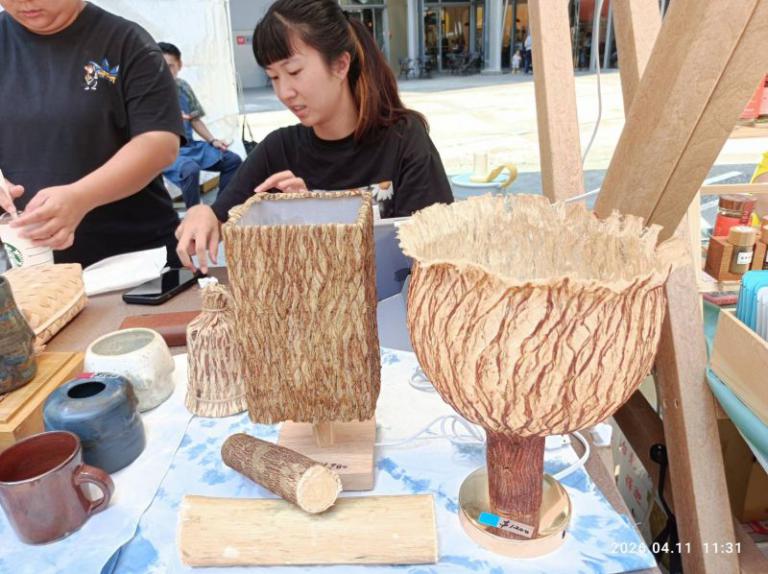 來自台東富岡社區的年輕人向參觀的消費者說,富岡社區在富岡漁港附近,社區除了推廣魚市場的導覽,社區青年帶著長輩利用樹皮製作燈罩,樹皮燈罩美觀又實用,希望觀光客去綠島玩的同時,也能在富岡漁港逛一逛,來社區看一看,那裏是個有著充滿質樸風的漁港。