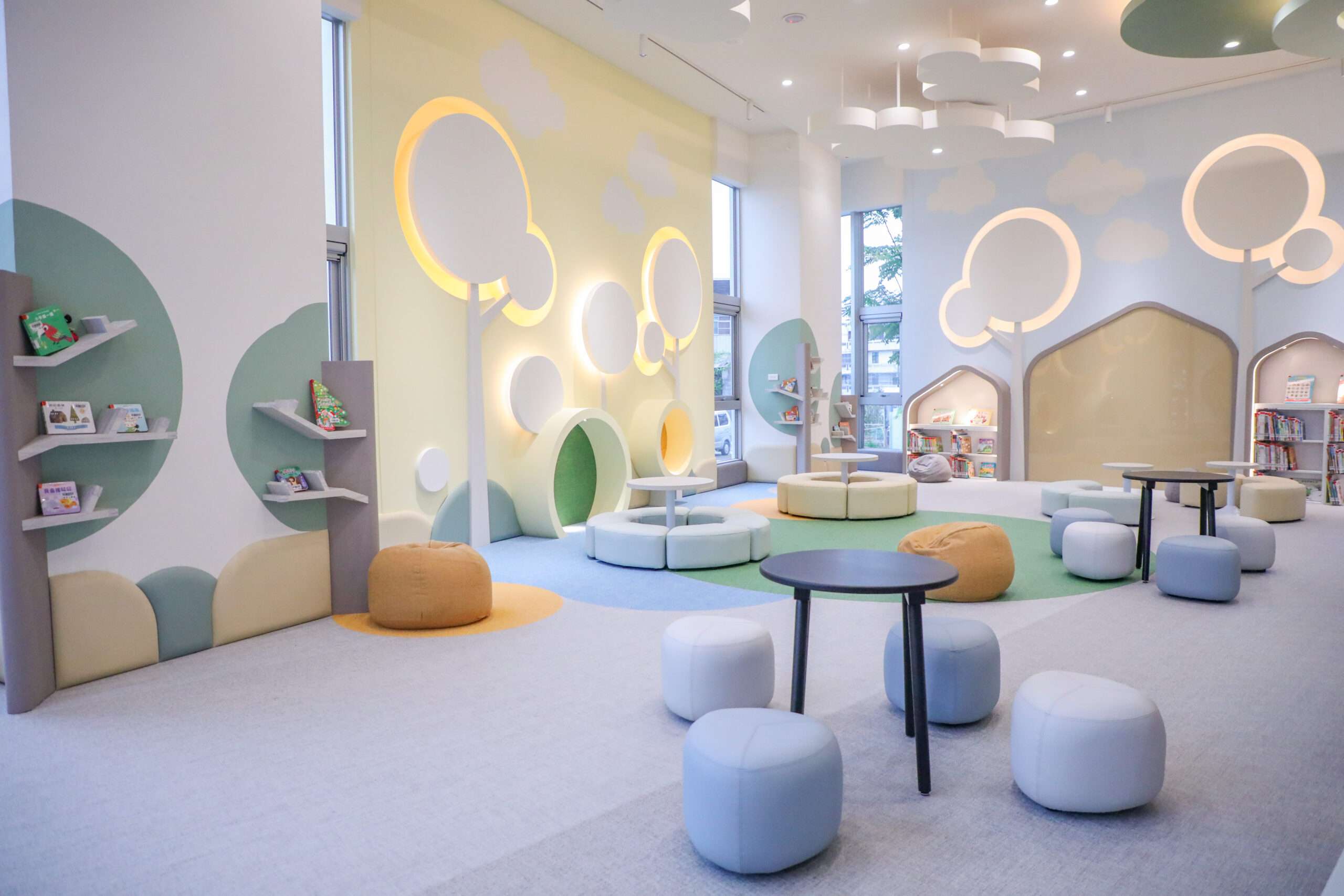 2. 圖書館(中市圖): 採分齡、分棟設計,為兒童、青少年及樂齡者分別規劃獨立場域,創造兼具專業性與舒適度的全齡閱讀空間。