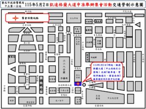 圖:嘉義縣政府警察局提供 報新聞/編輯部 嘉義縣新港奉天宮舉辦「2025跑出金虎爺全國路跑賽」活動,本次參賽選手將有6279人,為避免新港奉天宮前廣場及新港鄉中山路段大量車流湧入市區街道造成危險,訂於114年11月22日(星期六)下午2時至114年11月23日(星期日)12時止,針對奉天宮周邊道路規劃交通疏導管制及替代路線如下:一、 會場彈性交通管制(禁止車輛進入):(一) 古民街與新民路口。(二) 古民街與登雲路口。(三) 古民街與文昌街口。(四) 中正路與新民路口。(五) 中正路與福德路口。(六) 中正路與登雲路口。(七) 中山路與嘉159線路口。. 圖:嘉義縣政府警察局提供 二、 例外車輛:執行公務車輛、記者及管制區內居民車輛出入。於114年11月23日4時(星期日)起至10時止,管制車輛進入新港鄉中山路(進入新港市區道路),建議車輛改道路線:嘉民路→164線→新港街道或行駛159線→新中路→157線→新港街道。該活動期間提供各項為民服務措施,如有需要請撥打嘉義縣警察局民雄分局新港分駐所(05)3742009。 圖:嘉義縣政府警察局提供 Please enable JavaScript to view the comments powered by Disqus.