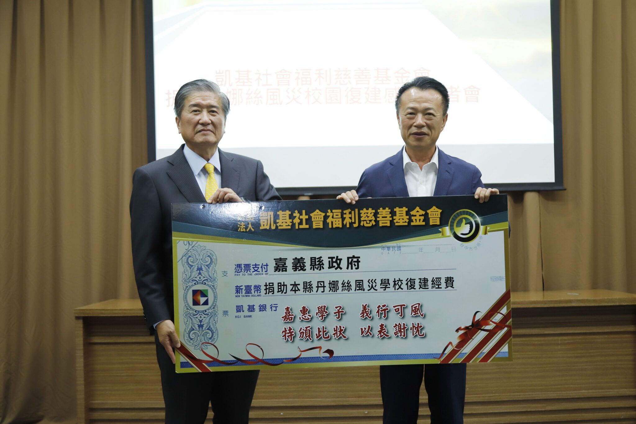 嘉義縣校園今年7月受到丹娜絲颱風摧殘災損嚴重,有賴各界援助順利開學,凱基社會福利慈善基金會捐贈10所學校復建經費308萬元,縣府今15日舉辦感恩記者會,基金會執行長曾錦隆等多名代表出席,縣長翁章梁代表嘉縣傳達感謝之意,同時安排學生表演及多名曾受基金會幫助的國中小校長與會獻上謝卡,感恩雪中送炭的溫情。