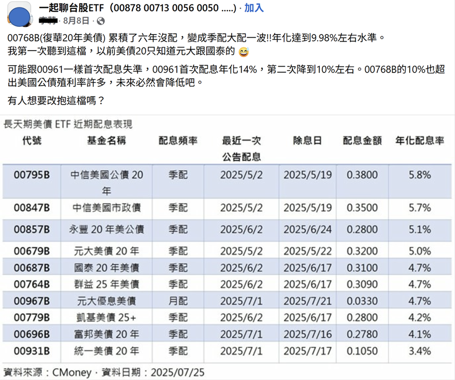 復華20年美債ETF(00768B)自宣布改採季季配息制度後,在投資社群討論熱度不斷。早在8月初,就有網友在《一起聊台股ETF》社團分享心得指出:「00768B累積了六年沒配息,這次直接改成季配,大配一波,年化達到約9.98%水準,我第一次聽到這檔,以前只知道元大跟國泰的美債ETF!」貼文一出,立即引發投資人熱烈回應。