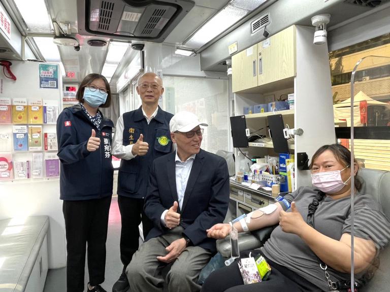 ▲社會局蔡宛芬局長(左1)、衛生局黃志中局長(左2)及財團法人大大數位慈善基金會李大維榮譽董事長(右2)一起參觀捐血車並感謝挽袖捐血熱心民眾。(圖/社會局提供)