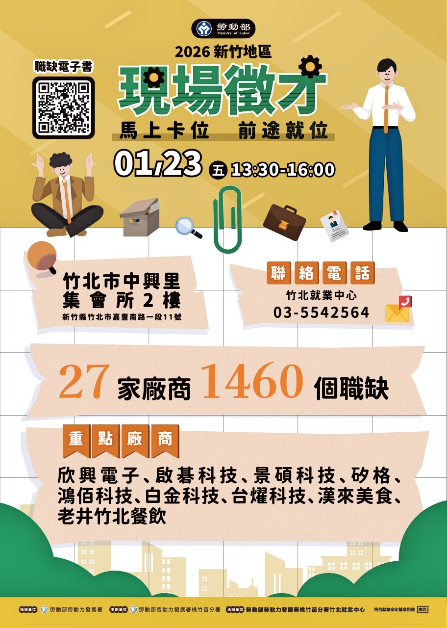 為協助待業與轉職民眾在農曆年前找個好工作及年後轉職搶先佈局,勞動部勞動力發展署桃竹苗分署於1月23日下午1點30分至4點,在竹北市中興里集會所二樓 (新竹縣竹北市嘉豐南路一段11號)舉辦「2026年新竹地區現場徵才活動」,邀請科技業、製造業、零售業、餐飲服務業等共計27家知名廠商,提供高達1,490個優質職缺,不少企業招募主管及儲備幹部人才,歡迎有求職、轉職或是想在年前尋找全新職涯機遇的朋友踴躍參加。