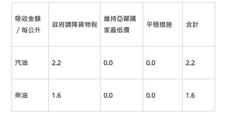 按浮動油價機制調整原則,汽、柴油價格每公升應各不予調整,已低於亞洲鄰近國家(日、韓、港、星)。吸收金額如下表: