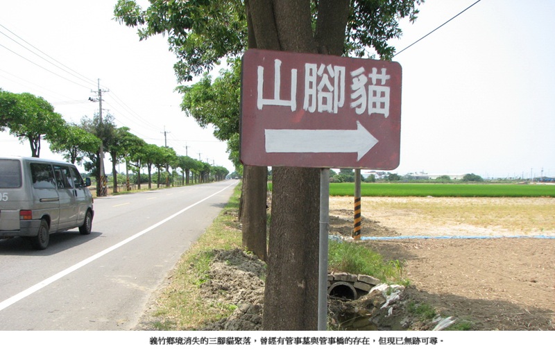 嘉義縣義竹鄉埤前村所轄的三腳貓聚落,相傳在清代年間是非常繁榮的大村落,工商百業店家林立,光是布莊就多達十幾家,晚近數年前,也有農家在耕地挖出一些俗稱「孔方兄」的龍銀硬幣及陶瓷古磚,但目前三腳貓這聚落已經散庄。