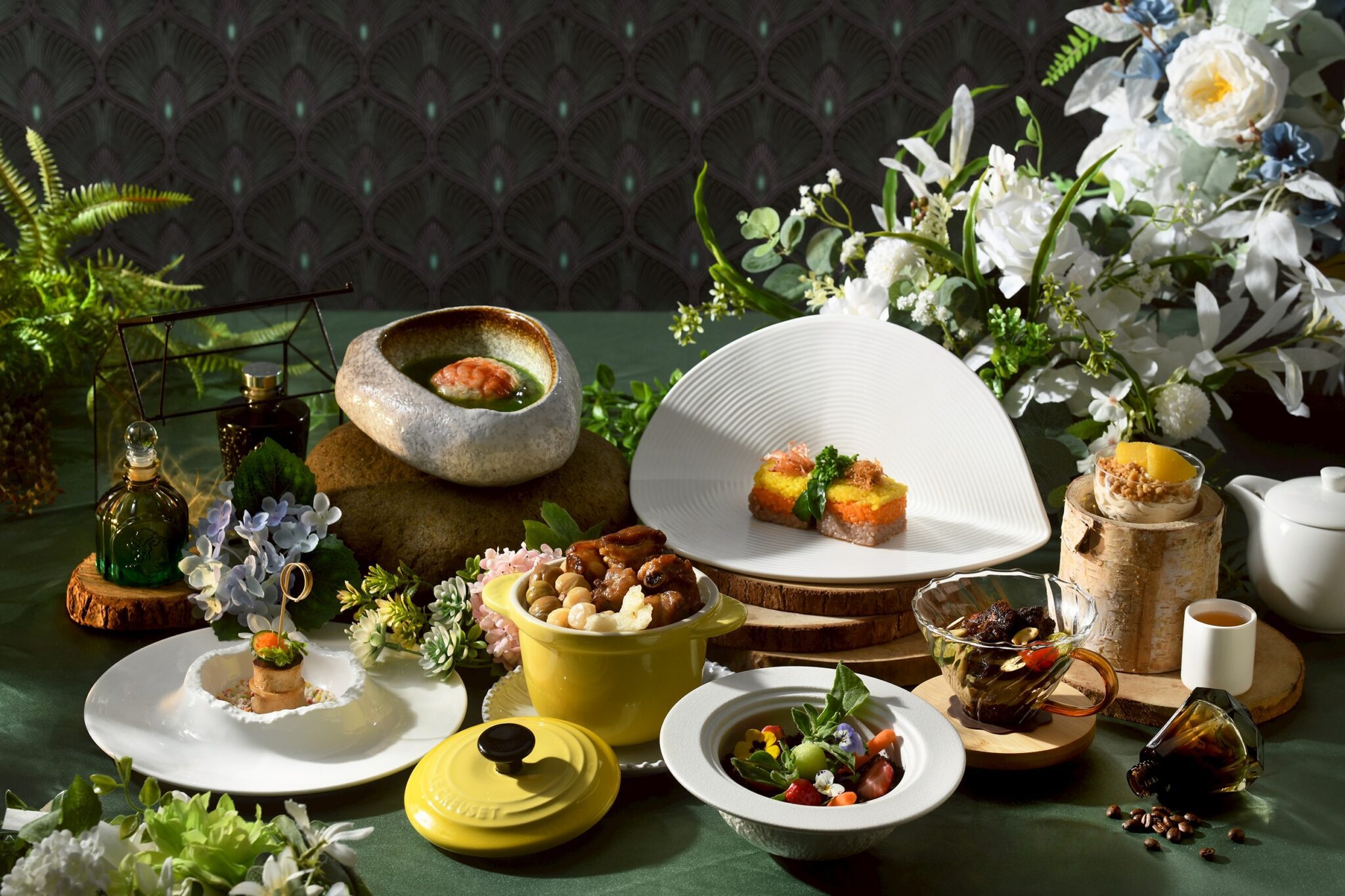 圖:主廚以自然元素作為靈感,將多道創意料理以花藝與木質調烘托,營造如走入綠意餐桌的節氣盛宴。