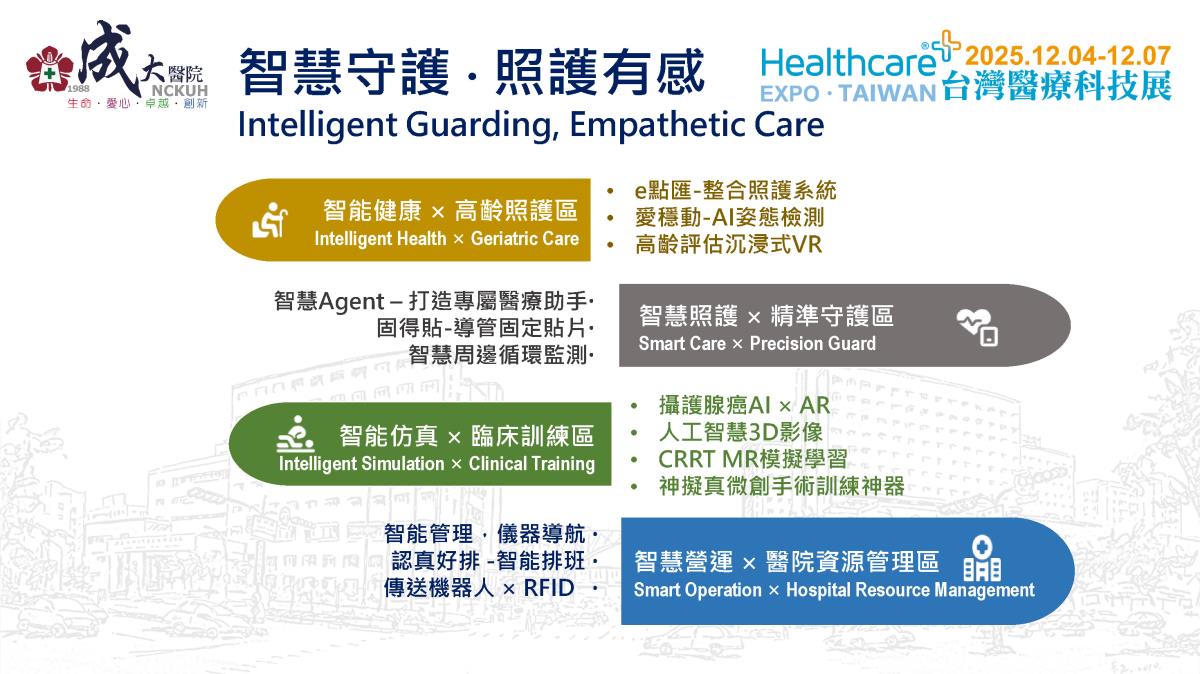 記者黃冠源/報導 2025台灣醫療科技展於12月4日至12月7日在台北南港展覽館舉行。成大醫院以「智慧守護・照護有感」為主軸,整合臨床、資訊、教學、長照、生醫工程與創新研發,推出4大展區、13項重點成果,全面呈現智慧醫療在照護、訓練、精準治療與院務治理中的應用,展現成大醫院邁向精準健康世代的創新藍圖。