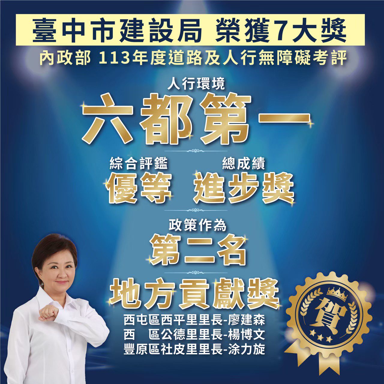 台中市在市長盧秀燕「人本、安全、宜居」的施政理念帶領下,市府建設局以高效率全面貫徹執行,涵蓋重大交通建設、人本街道環境到推動「台中美樂地計畫」打造全齡共融公園等各個層面;建設局以紮實的高規格工程實力,不僅成功突破多項地方重大建設瓶頸,優質成果屢獲中央肯定,實質提升市民生活品質,讓台中市更趨便利、安心與美好,市民最有感。