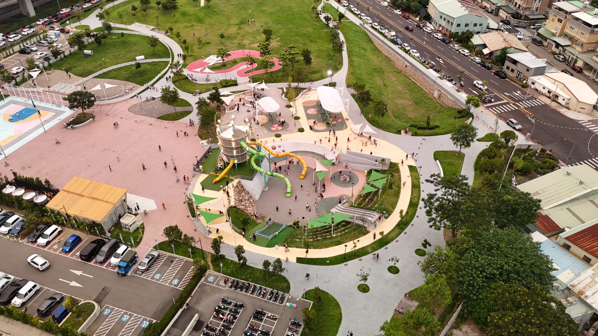 在公園建設方面,自108年起推動「台中美樂地」計畫,以「全齡共融」為核心,讓公園成為市民的生活日常。目前已累計完成 232 座共融公園,新闢與改善成果遍及全市。全市 682 處兒童遊戲場更已提前完成安全檢驗與備查,達成 100% 合格率,是全國數量最多且密度最高的城市。特色公園也蓬勃發展,包括擁有全國最高 11 公尺高塔溜滑梯的太平馬卡龍公園、設置全國最長 32 公尺溜索的中央公園、以及市內首座以交通教育為主題的泉源兒童交通公園等;而為因應極端高溫,美樂地 3.0 更聚焦降溫遮陽、增植喬木等設施,提升公園的舒適度。