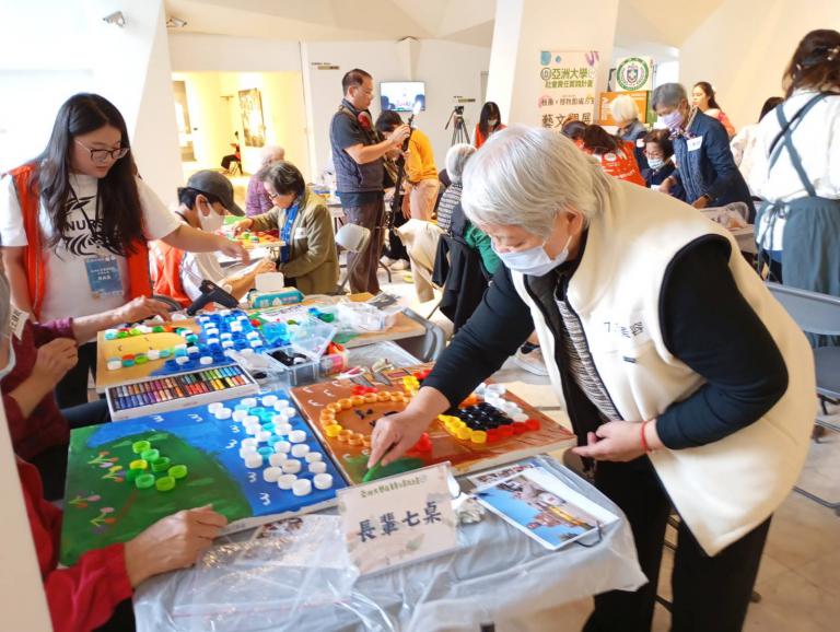 ▲這次活動以「創作、互動、陪伴」為主題,特別安排瓶蓋毛線手作課程,鼓勵長輩們動手創作、彼此交流。(圖╱記者孔亮云攝)