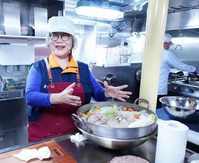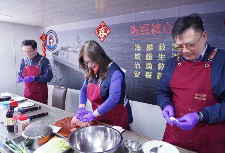 明天小年夜,大後天就是春節圍爐,海洋委員會主委管碧玲昨天與海巡署長、艦隊分署長,三人同登長濱艦親手製作年菜慰勞海巡基層,這是管主委連續三年,為海巡同仁親自下廚料理。管碧玲堅持獅子頭要純手工揉捏出筋,加入大量蔬菜烹煮,滿滿的疼惜與關懷入味,用媽媽的愛,謝謝海巡守護國家!