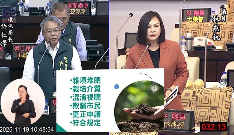 ▲林燕祝:中央全面禁止廚餘養豬後,造成廚餘之亂,建議市府盡快規劃蓋生質能源廠,將資源循環利用。